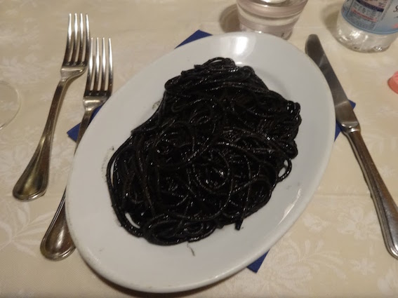 ちょっとびっくりしたのですが、イタリアではパスタは前菜の扱いのようです。日本だとしっかりメインで食べるイメージですよね。しかし前菜とは思えぬボリュームのイカスミパスタでした。メインの時点でかなりお腹いっぱい。